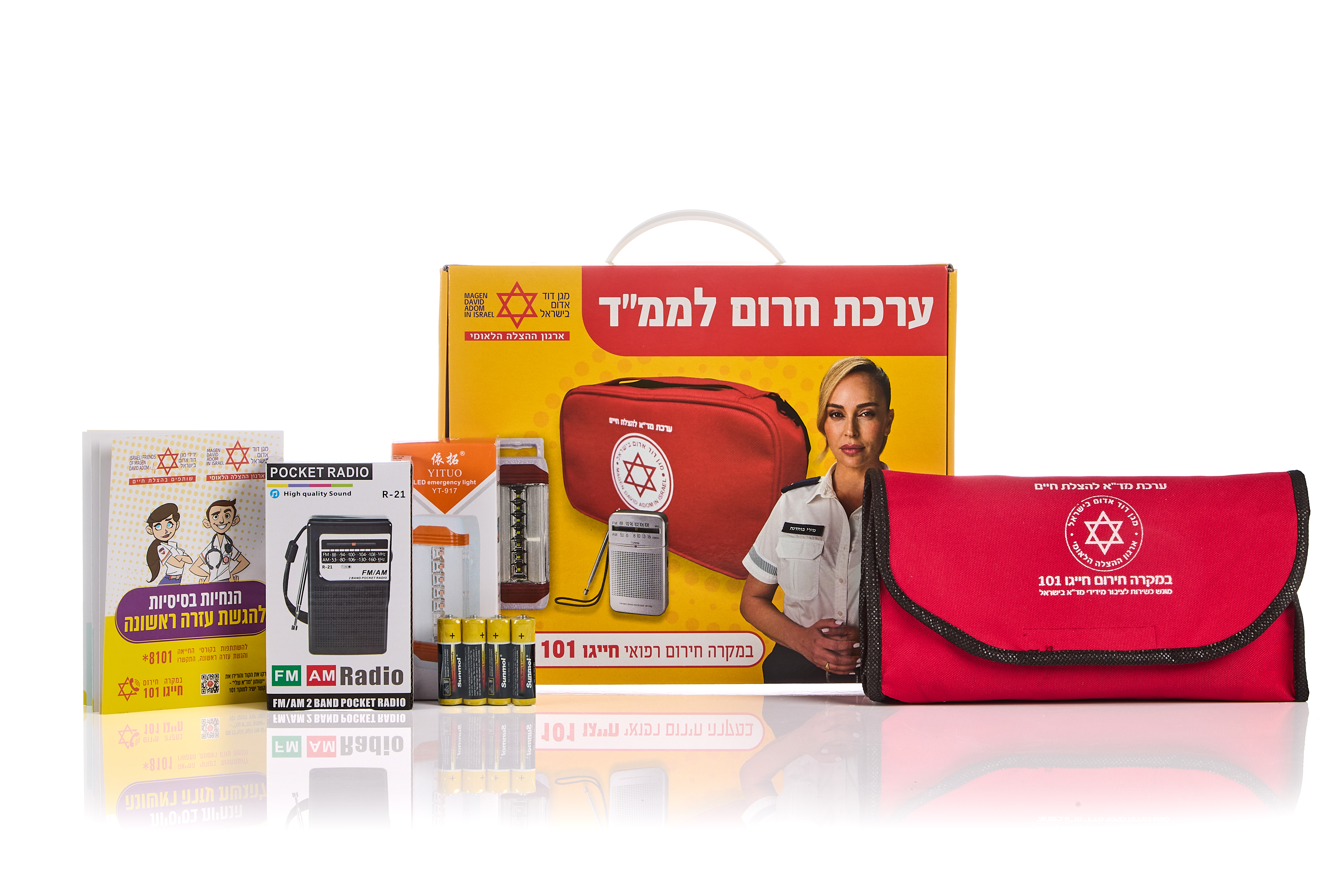 בתרומה של 540 ₪ - ערכת עזרה ראשונה לממ"ד מתנה (כוללת פנס, טרנזיסטור וציוד עזרה ראשונה)