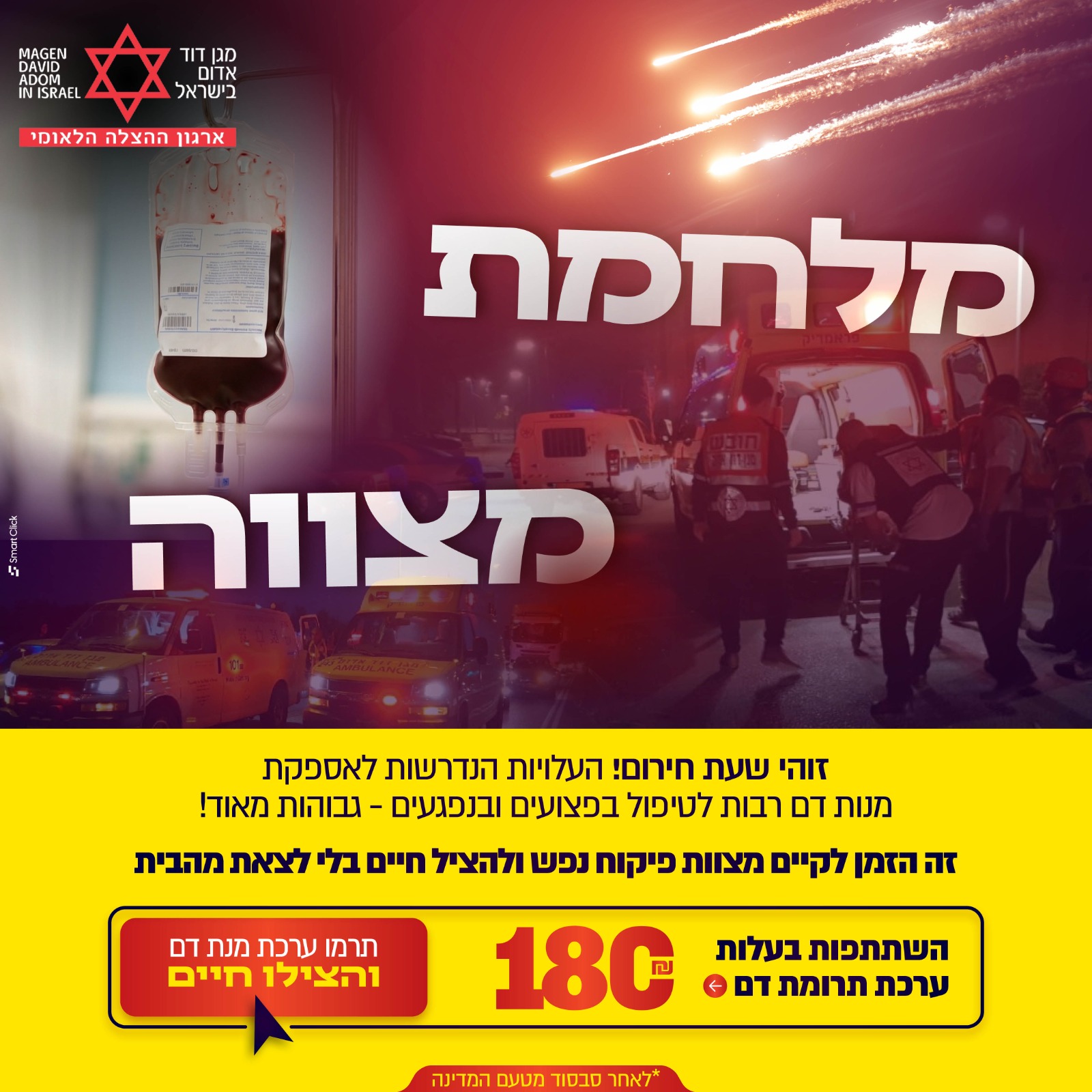 מאז השבעה באוקטובר מדינת ישראל נמצאת במלחמה. מול סכנת הטילים מאיראן וההסלמה בכל החזיתות, בנק הדם של מד"א מחויב להעמיד מלאי חירום חסר תקדים, שיהיה זמין ומוכן לכל תרחיש.